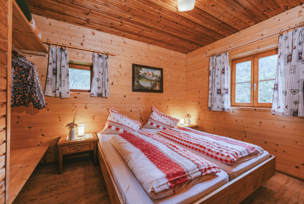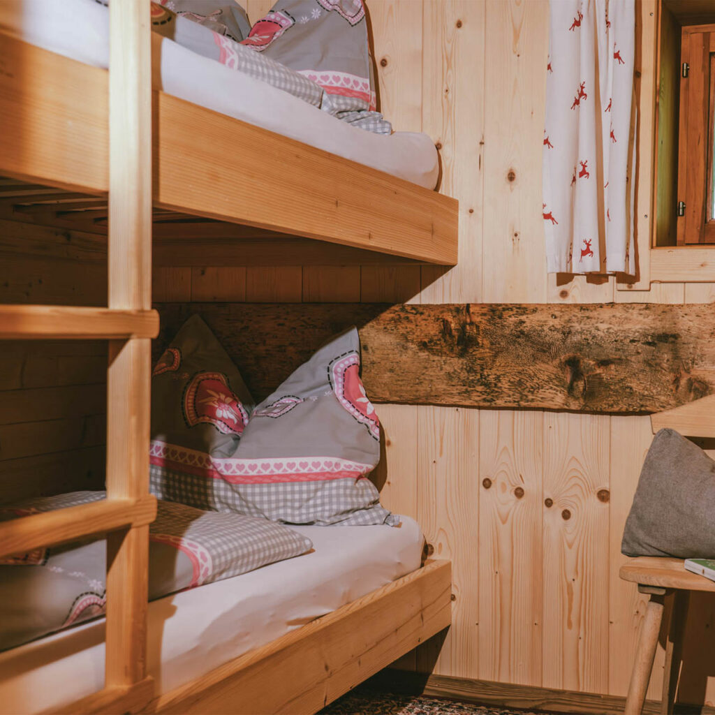 In unseren vier gemütlichen Schlafzimmern, teils mit Stockbetten, spürst du den authentischen Hüttencharakter. Das heimische Holz sorgt für ein angenehmes Raumklima und süße Träume.
